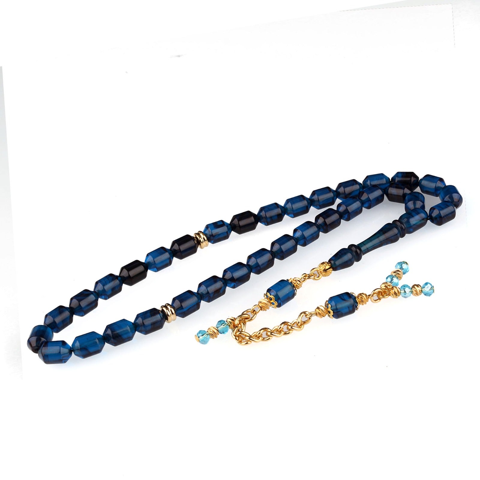 Lacivert ateş kehribar taneler, gold renk metal ara parçalar ve turkuaz kristal detaylı zincirli püskül ile şık tesbih.