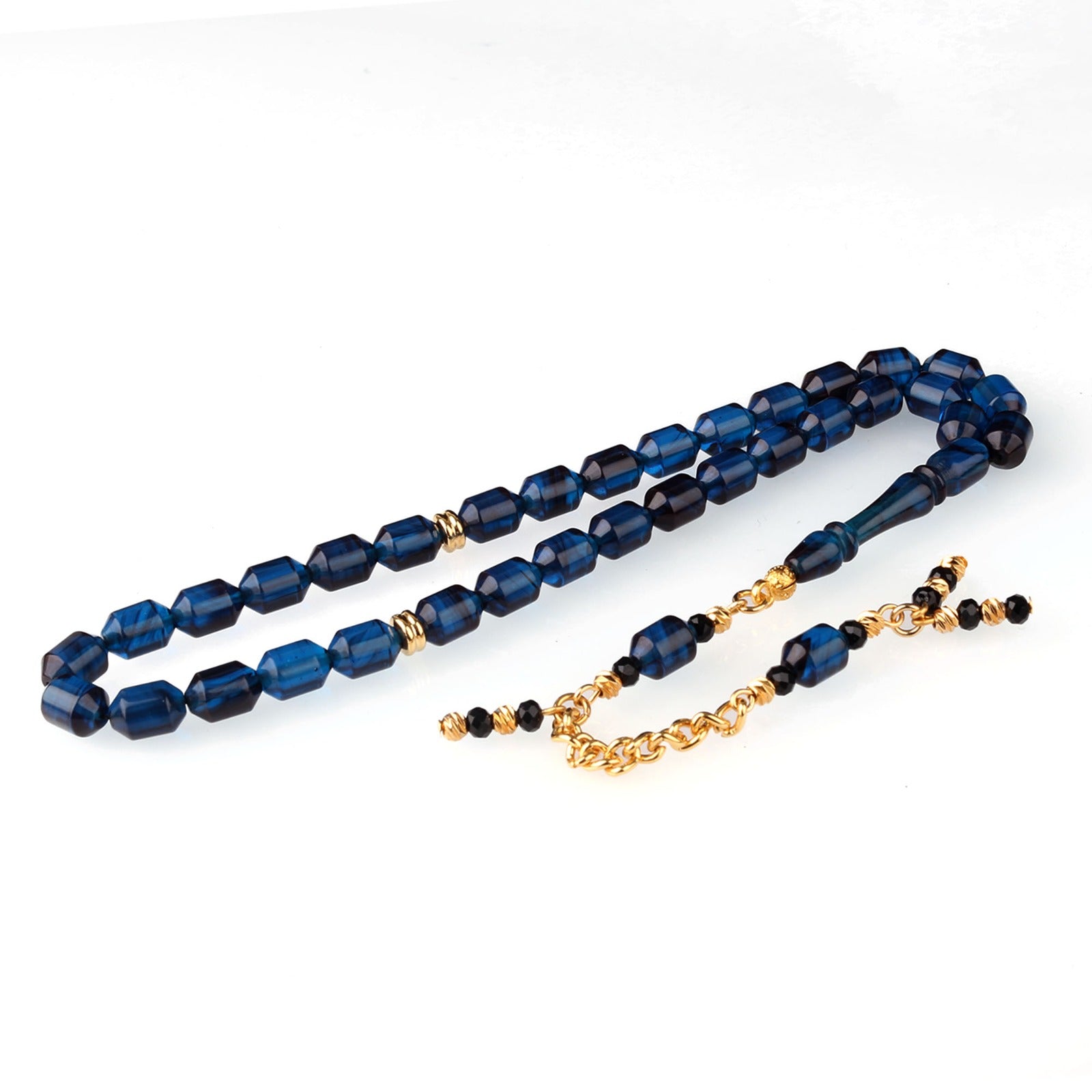 Lacivert ateş kehribar taneler, gold renk metal ara parçalar ve siyah boncuk detaylı zincir püskül ile şık tesbih. Günlük kullanım ve hediye için idealdir.