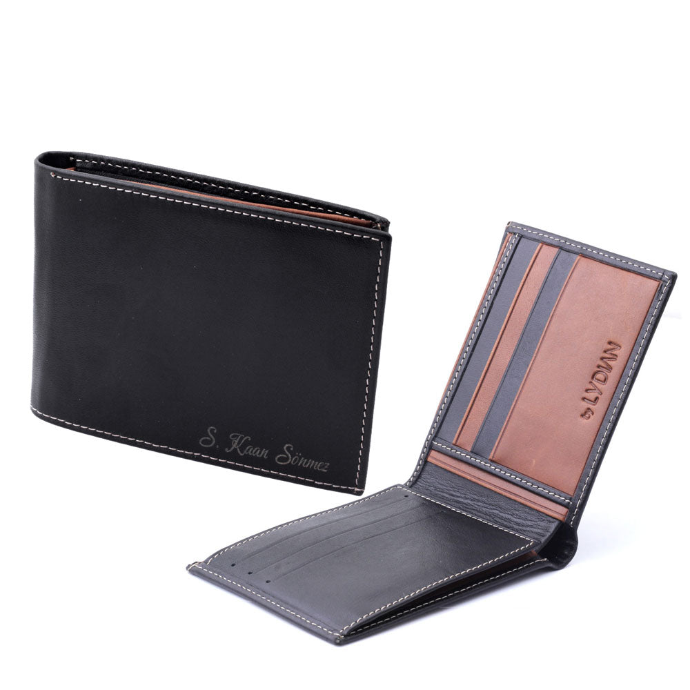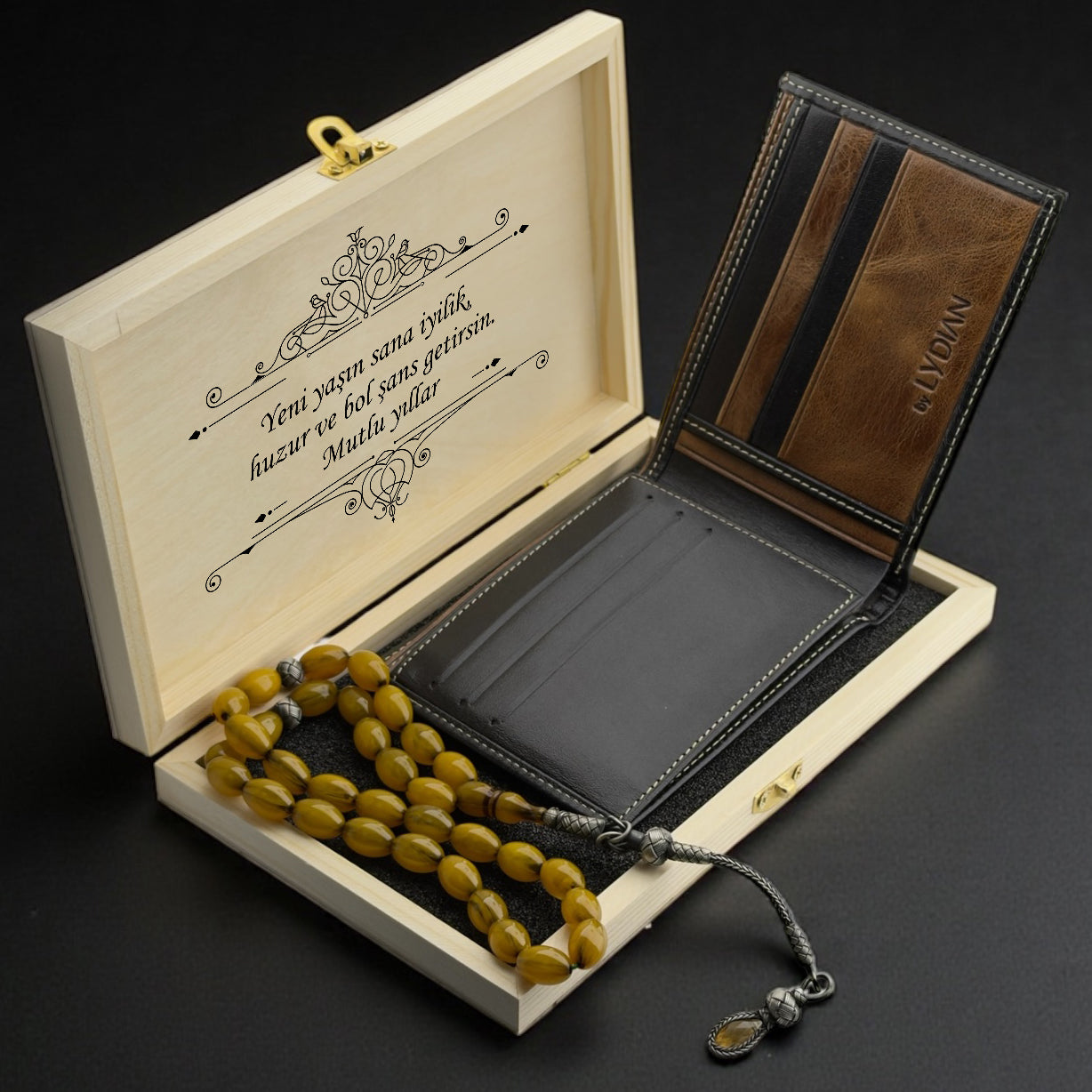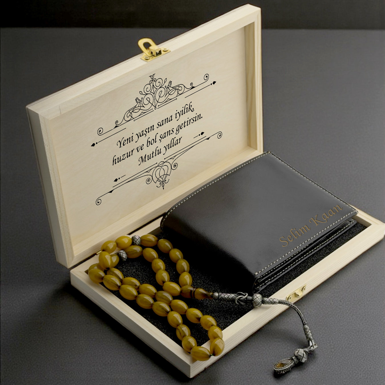 Kişiye özel yazılı deri cüzdan ve 925 ayar gümüş detaylı tesbih, şık hediye kutusunda.