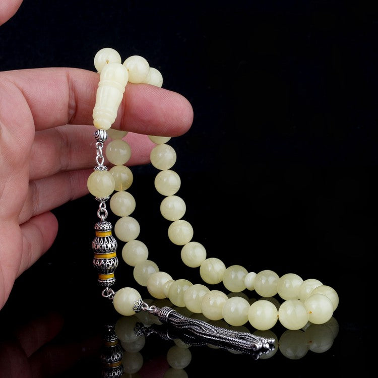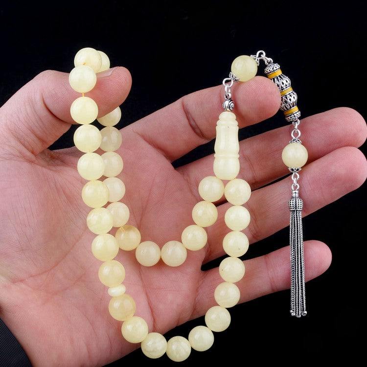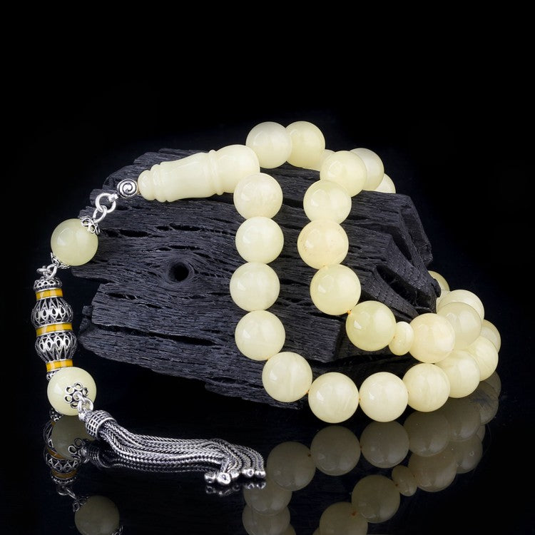 Saf Sarı – 925 Ayar Gümüş Püsküllü Kehribar Tesbih