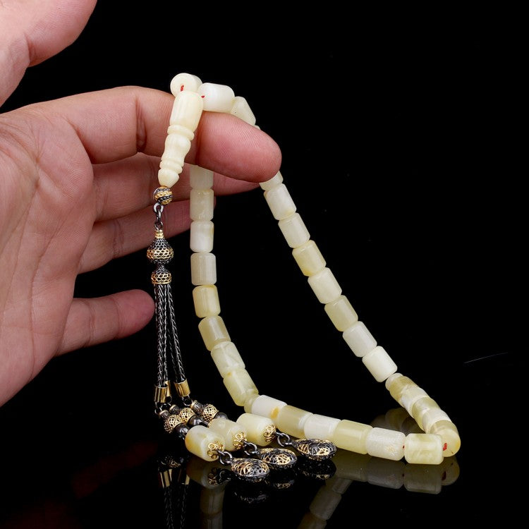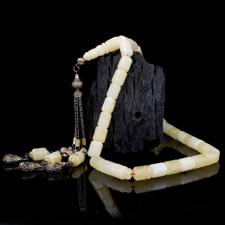 Sarı renkte, 925 ayar gümüş püsküllü, orijinal ve sertifikalı damla kehribar kesme model tesbih.