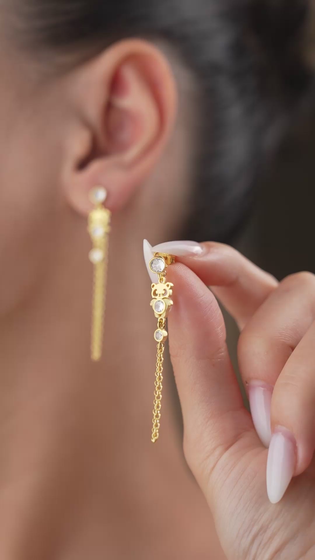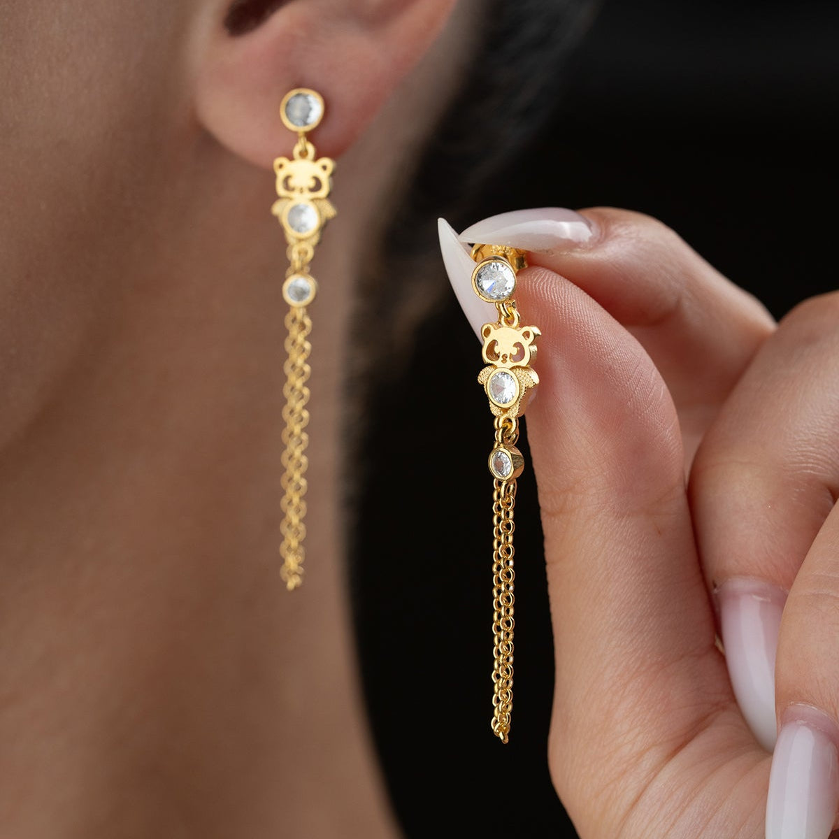Zirkon taşlı, altın kaplama zincirli panda figürlü 925 ayar sallantılı küpe.