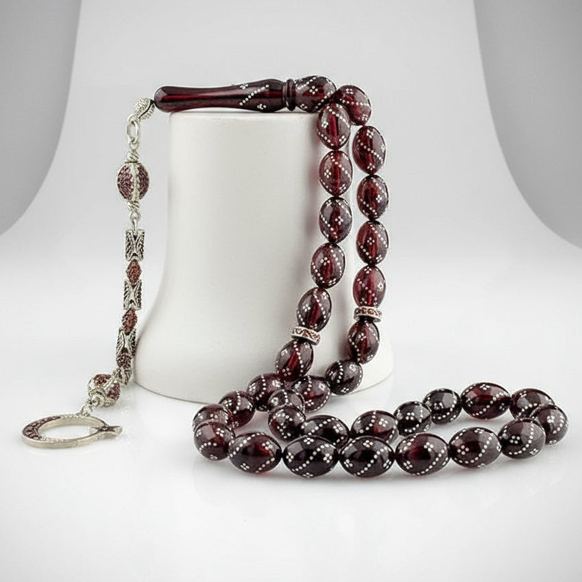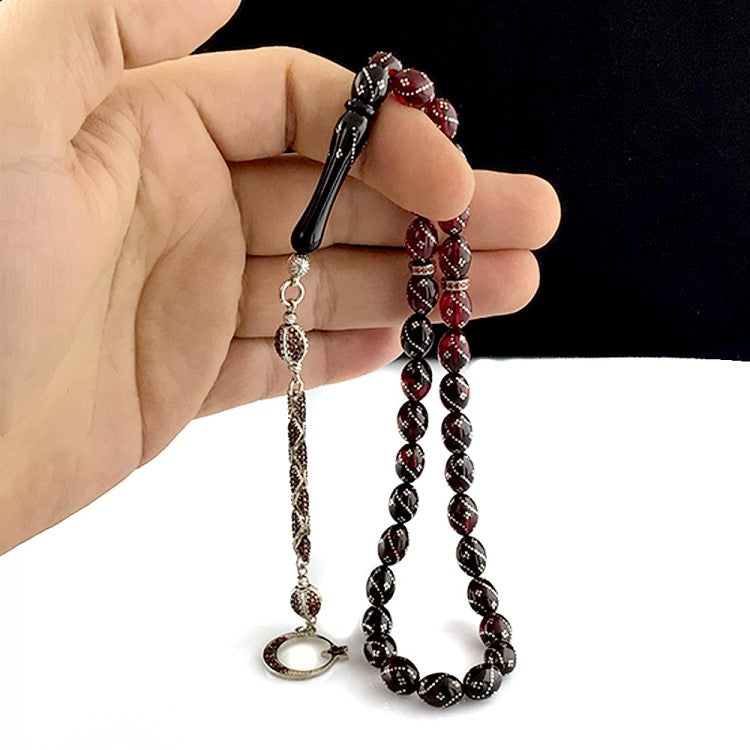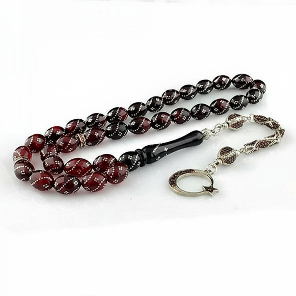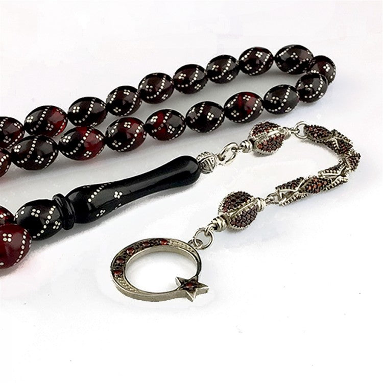 Gümüş işlemeli, zirkon taş püsküllü, ay yıldız motifli ateş kehribar tesbih.