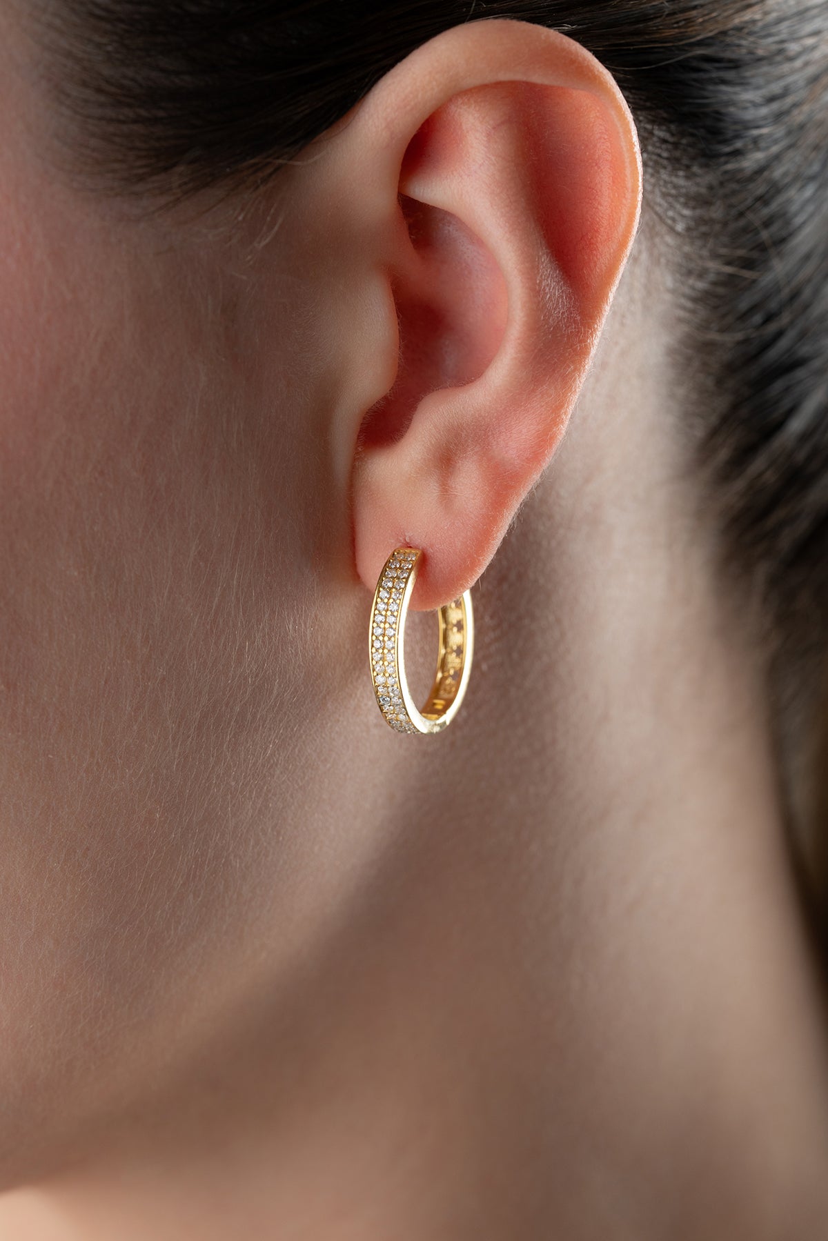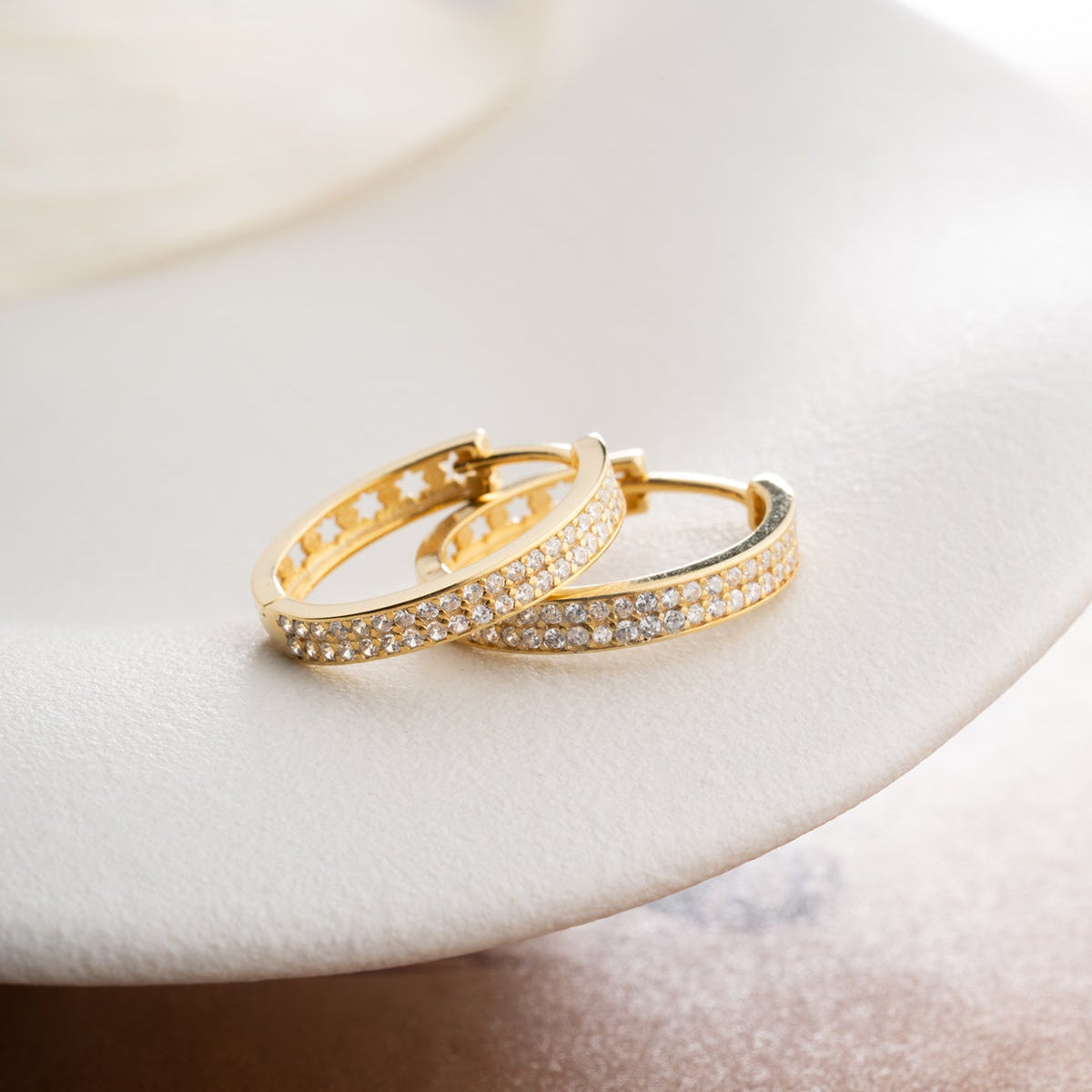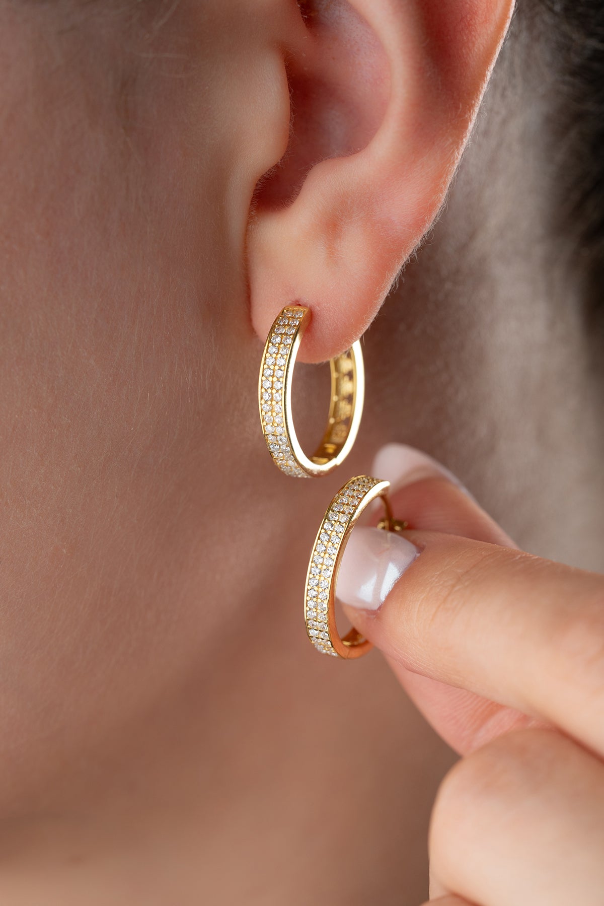 Işıltılı zirkon taşlarla süslenmiş bu halka küpe, hem altın kaplama hem de gümüş rengi seçeneğiyle şıklığınıza uyum sağlar. Günlük kombinlerinizden özel davetlerinize kadar her anınıza zarif bir dokunuş katar.