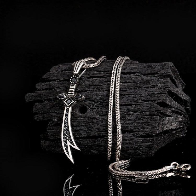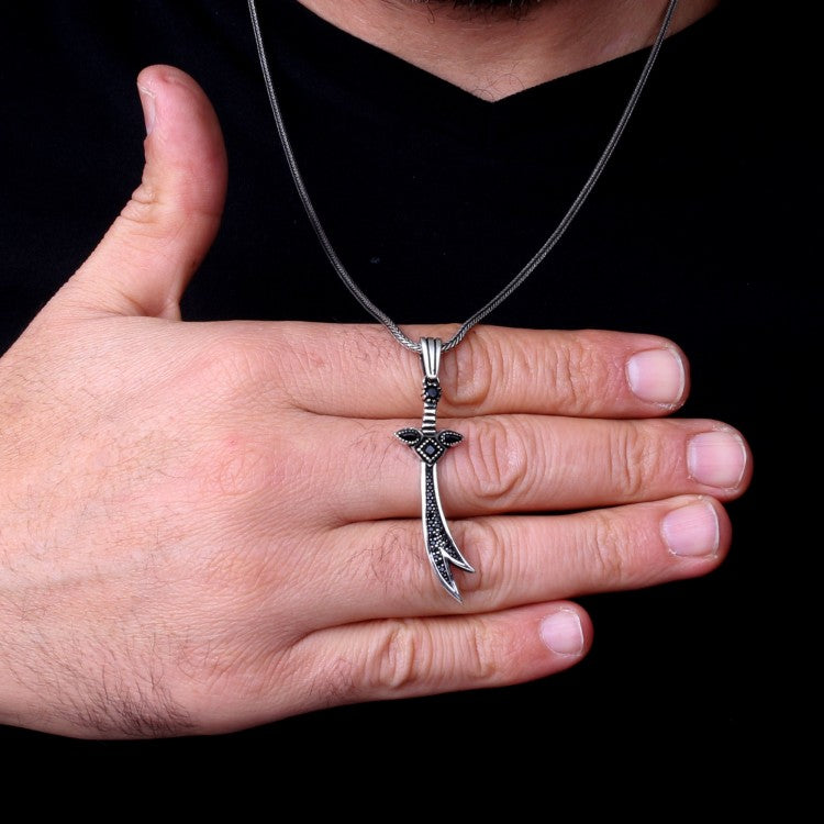 Siyah taş detaylı güçlü duruşa sahip 925 ayar gümüş Yavuz model kılıç kolye.