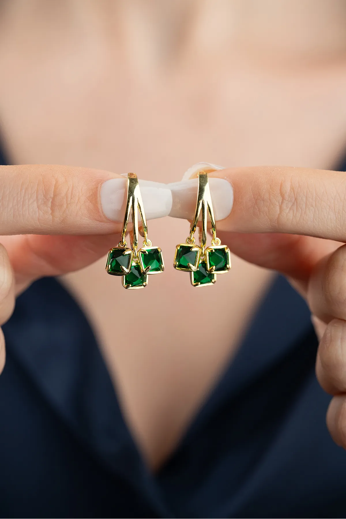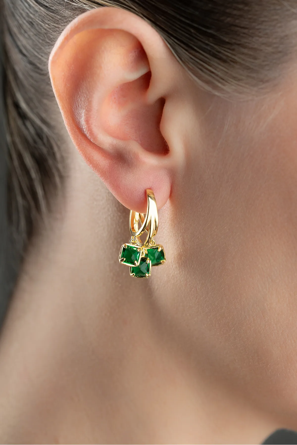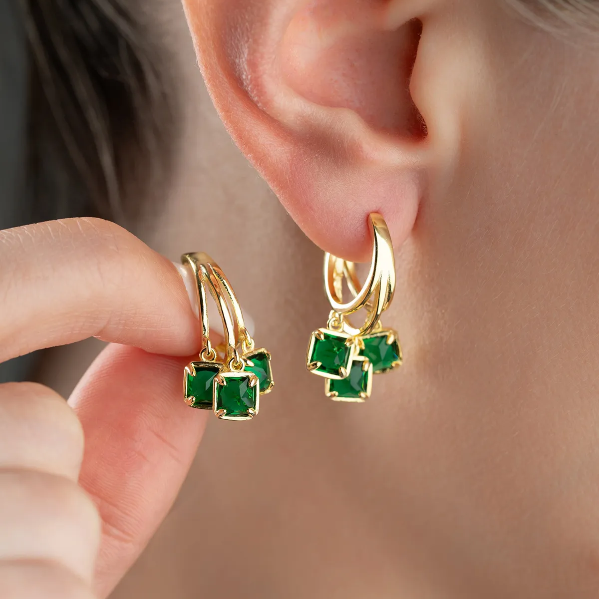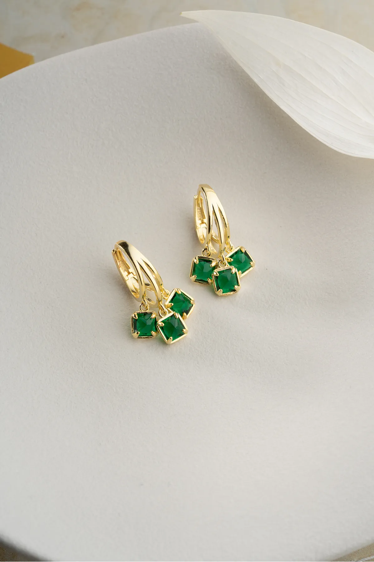 Zarafetin ve doğanın yeşil enerjisinin buluştuğu Zümrüt Işıltısı küpeler, 925 ayar gümüş üzerine altın kaplama ile tasarlandı. Üç adet kare kesim yeşil taş detayı ile stilinize sofistike bir dokunuş katın. Hem gündelik şıklık hem de özel anlar için ideal bir parça.