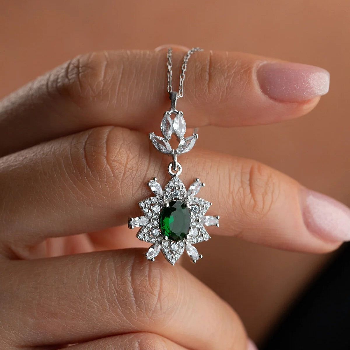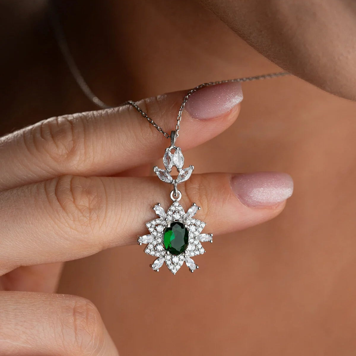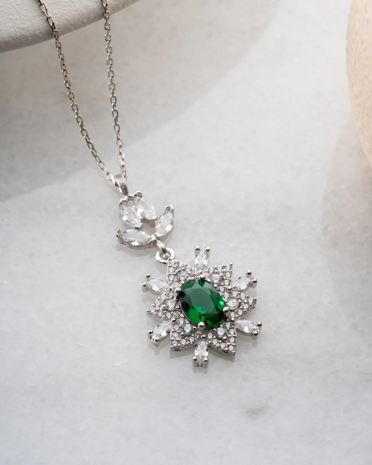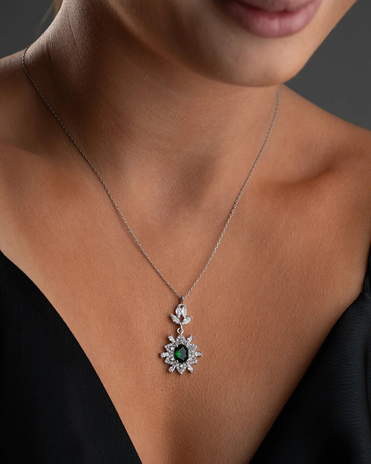 925 ayar gümüş, zümrüt yeşili merkez taşlı ve zirkon detaylı trend model kolye. Işıltılı tasarımıyla günlük ve özel günlere uyum sağlar.